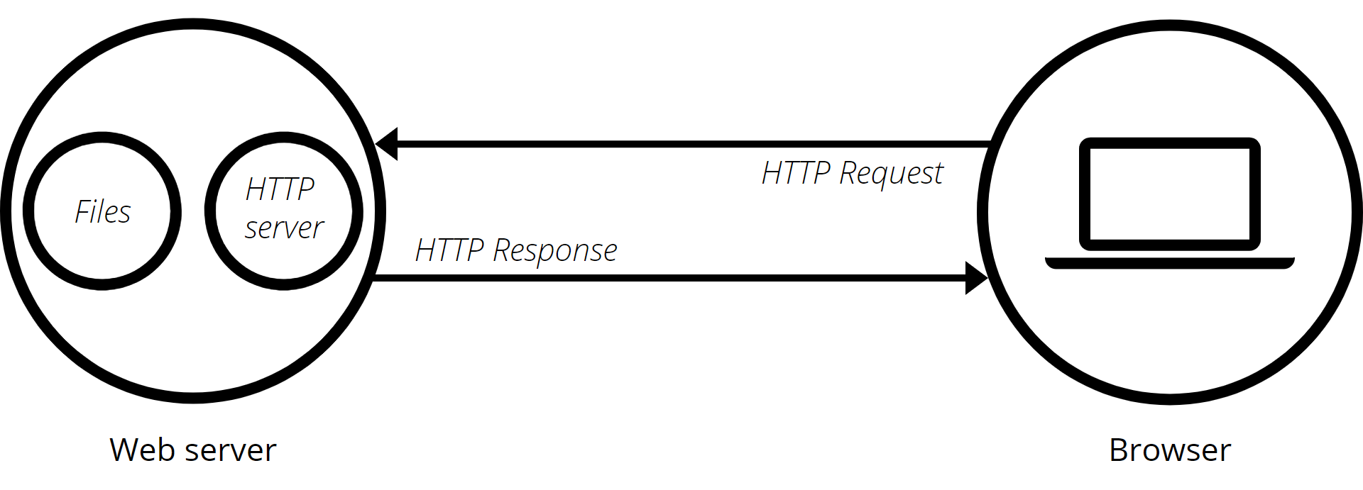 На самом базовом уровне, когда браузеру нужен файл, размещенный на веб-сервере, браузер запрашивает его через HTTP-протокол. Когда запрос достигает нужного веб-сервера ("железо"), сервер HTTP (ПО) принимает запрос, находит запрашиваемый документ (если нет, то сообщает об ошибке 404) и отправляет обратно, также через HTTP.
